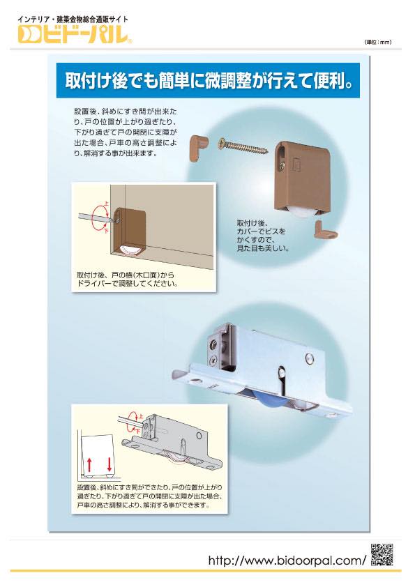 ※上下調整戸車とは…設置後、斜めに隙間ができたり、戸の位置の上がりすぎや下がりすぎで戸の開閉に支障が出た場合、戸車の高さ調整により、それを解消する事ができる戸車の事を言います。