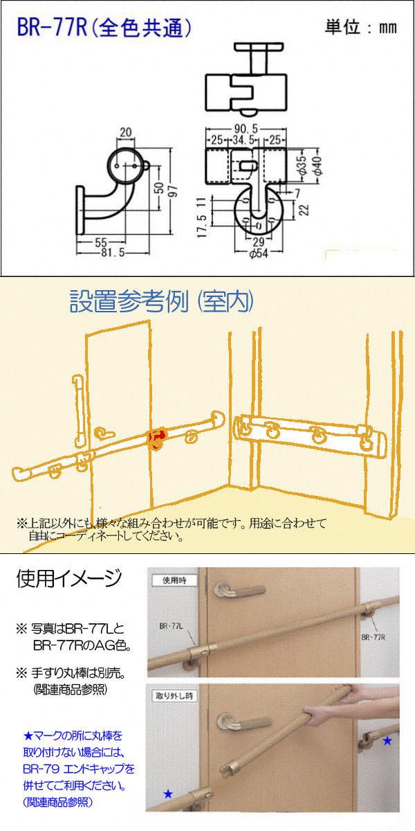 室内手すりをドア部にも取り付ける場合、部屋の出入りができるようドア部の手すりを脱着式にするブラケットです。シロクマ製。本体ブラケットと脱着用ブラケットのセット(右用)となります。適応丸棒サイズは35φ。