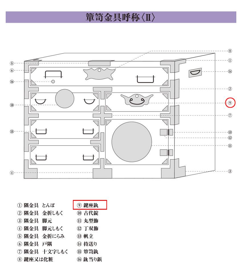 和風箪笥・家具金物メーカーとして名高い「西川商店」ブランドの鍵座かん付き。
