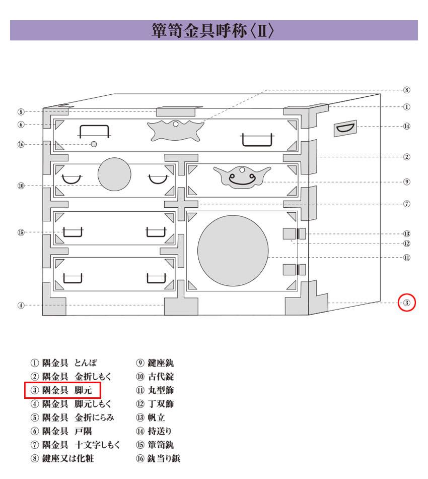 和風箪笥・家具金物メーカーとして名高い「西川商店」ブランドの隅金物。