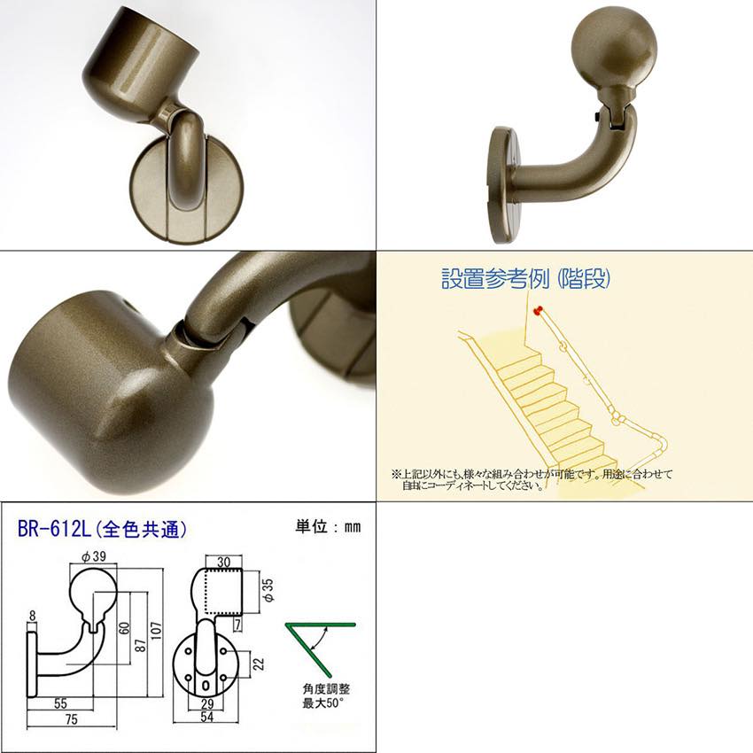 シロクマ製、室内用手すりブラケットのエンド部品(左用)です。階段の角度に合わせて手すりを平行に取り付けるための首振り機能付き(角度調整最大50度)。用途に合わせてご使用ください。