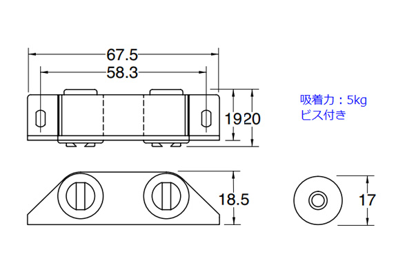軽量収納扉用、樹脂製のマグネットキャッチ(両開き用)。吸着力は5kg。この製品は箱単位(1箱: 50個入)での販売となります。