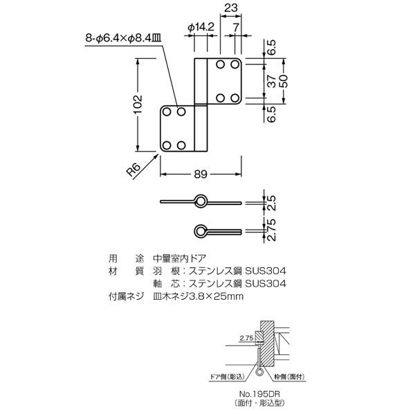 No.195DR ノイズレス旗蝶番(面付・彫込型) (ネジ付) ‐ (コード195DR)
