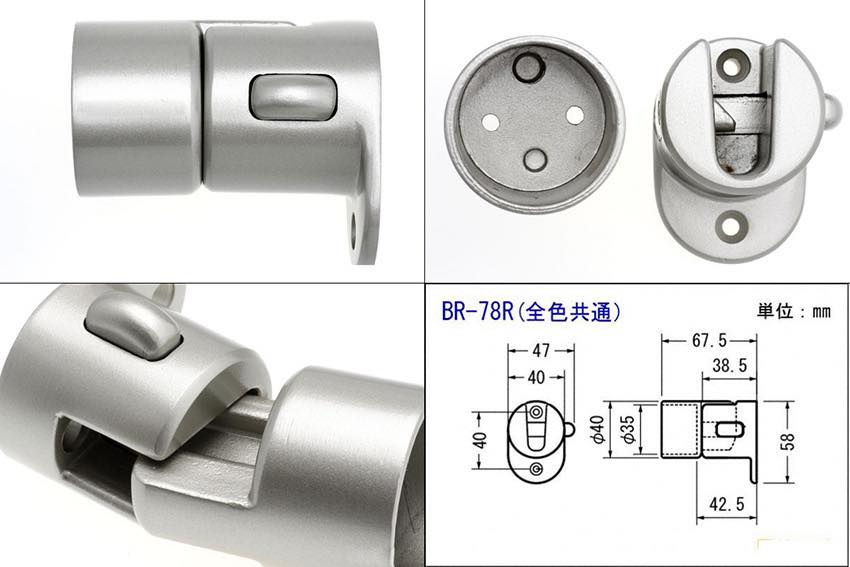 室内手すりをドア部分にも取り付ける場合、部屋の出入りができるようドア部の手すりを脱着式にするブラケットです。シロクマ製。本体ブラケットと脱着用ブラケットのセット(右用)となります。適応丸棒サイズは35φ。