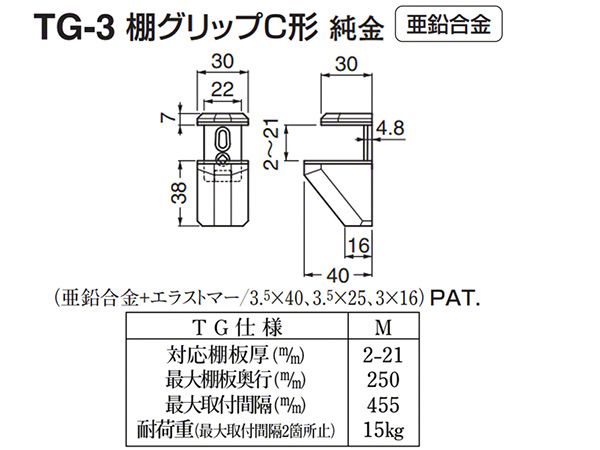 TG-3 棚グリップC形 純金 Mサイズ (対応棚板厚2-21mm)