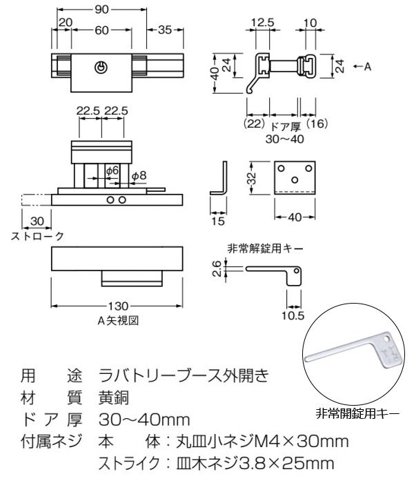 ラバトリーブース外開き用のスライドボルトです。対応戸厚は30-40mm。