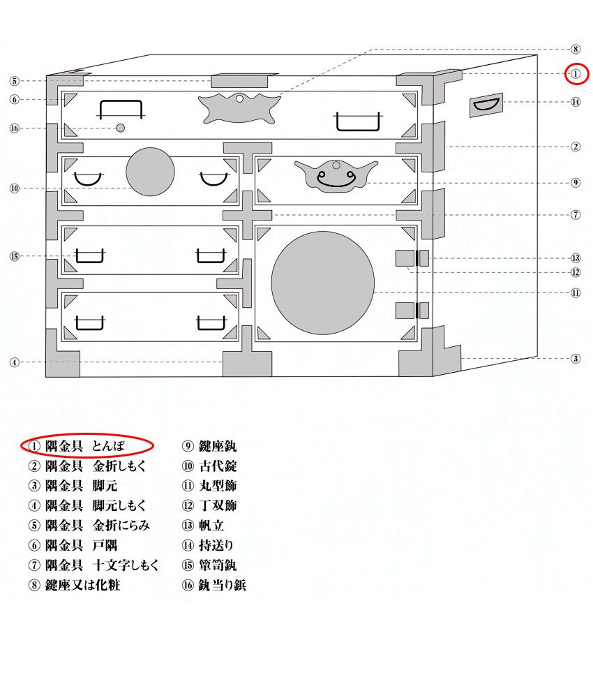 和風箪笥・家具金物メーカーとして名高い「西川商店」ブランドの隅金物。