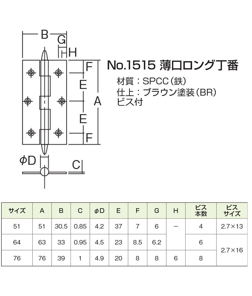 NO.1515 ロング丁番 ブラウン (ビス付) 51mm