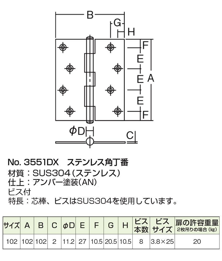 関連商品NO.3552DX 角丁番 (義星) ヘアーライン (リ… 2.0×102mm