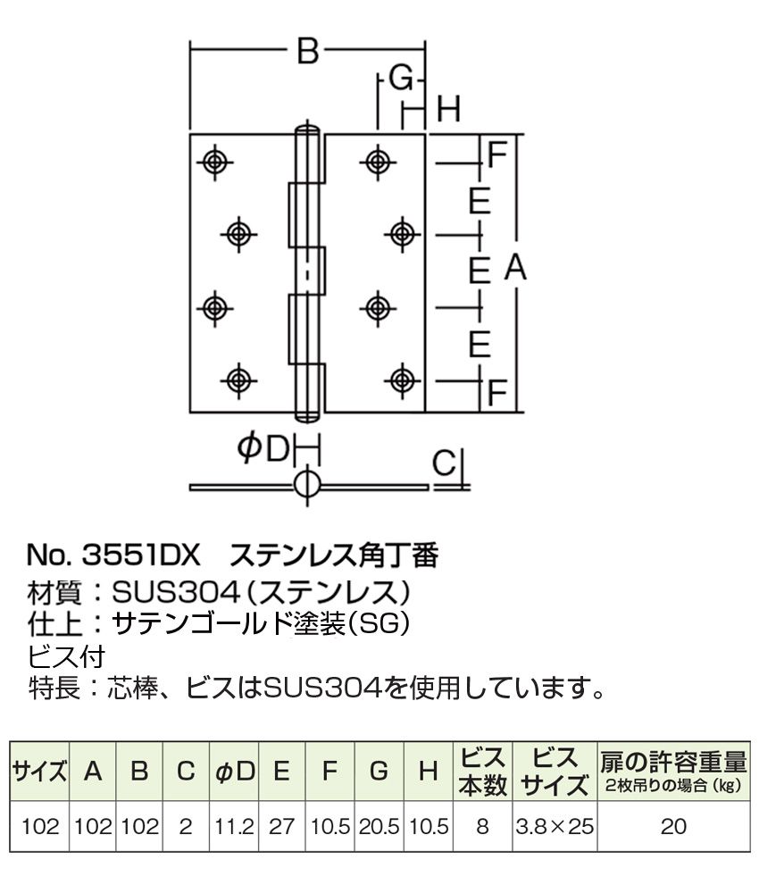 関連商品NO.3552DX 角丁番 (義星) ヘアーライン (リ… 2.0×102mm