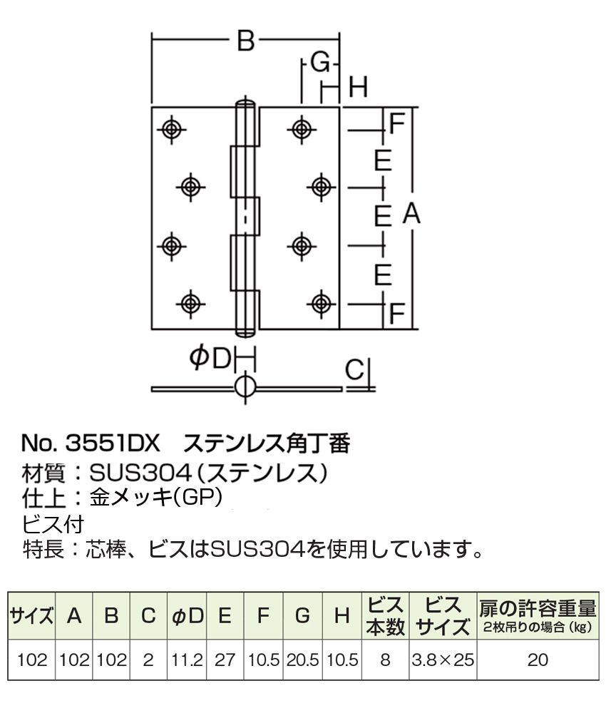 関連商品NO.3552DX 角丁番 (義星) ヘアーライン (リ… 2.0×102mm