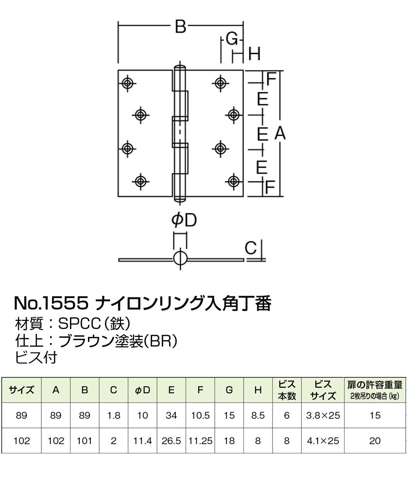 NO.1555 角丁番 (義星) ブラウン (リング入・ビス付) 89mm