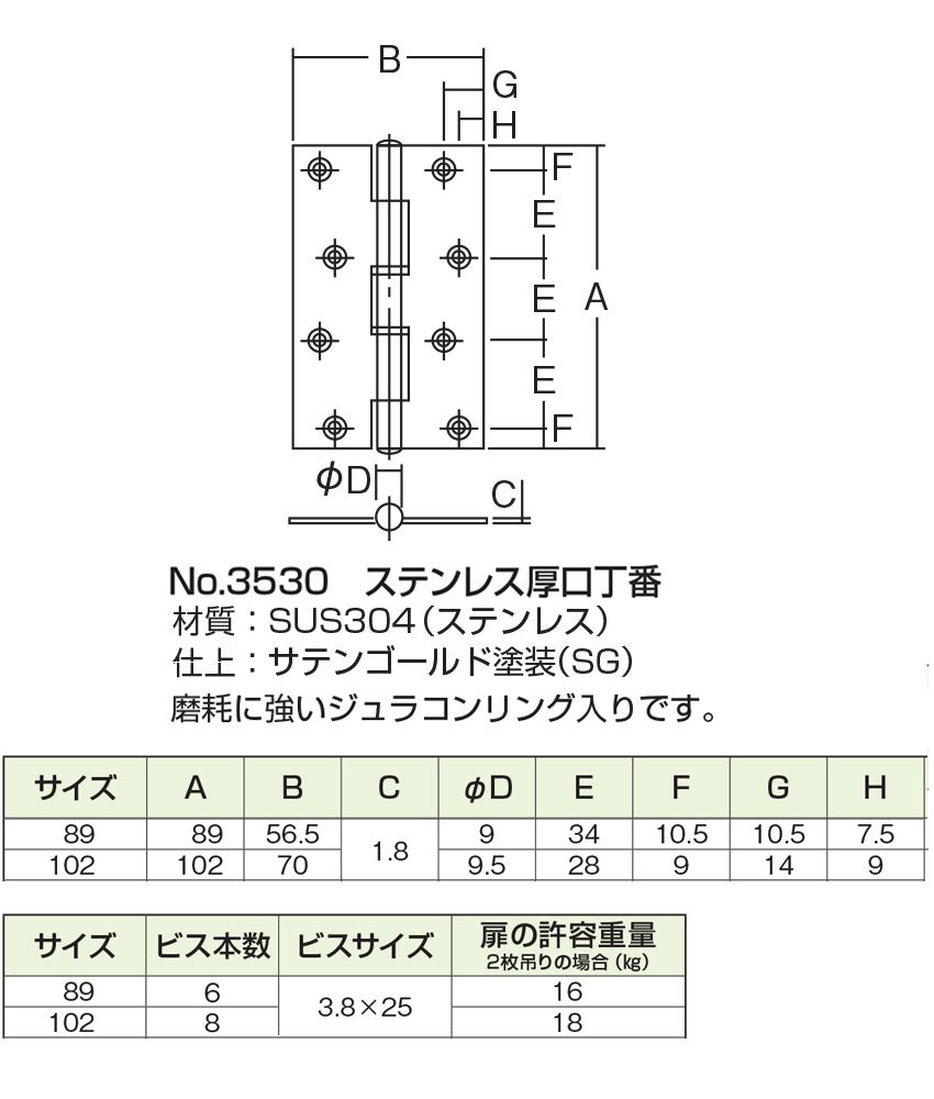 NO.3530 ステンレス厚口丁番 サテンゴールド (ビス付) 102mm
