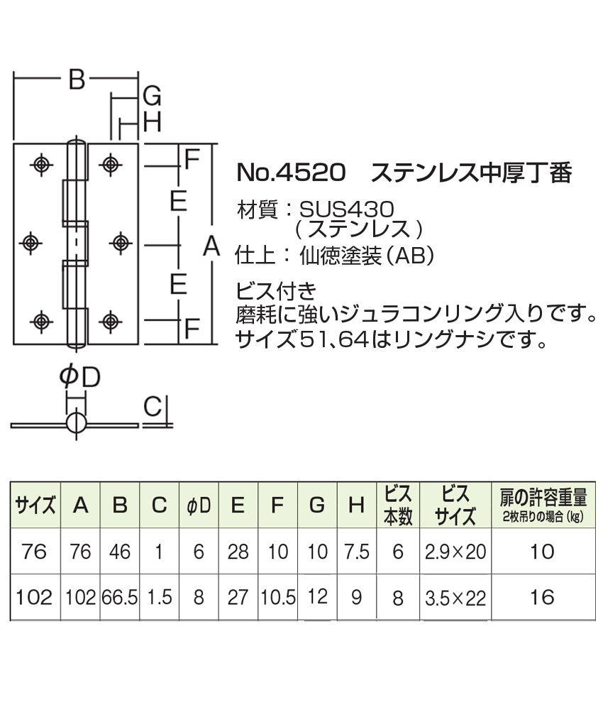 NO.4520 ステンレス中厚丁番 仙徳 (ビス付・リング有) 76mm