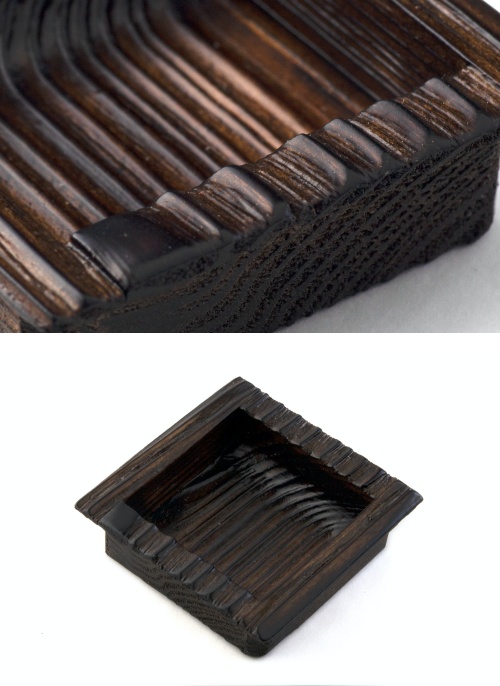 日本の伝統工法「焼杉」を応用した襖用(横引き)の木製引手です。裏面が円形の為、リフォーム案件でも引手穴をそのまま利用できて便利です(要サイズ・形状確認)。天然の杉材を使用し、特許製造法と浮造(うづくり:木目を浮き上がらせる表面加工)によって見た目のインパクトと滑らかで独特の手触りを実現しました。