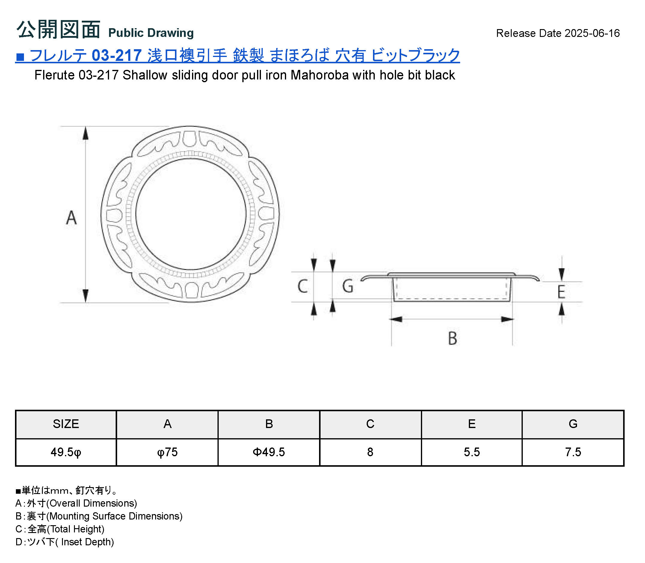 フレルテ 03-217 浅口襖引手 鉄製 まほろば 穴有 ビットブラック (49.5φ)