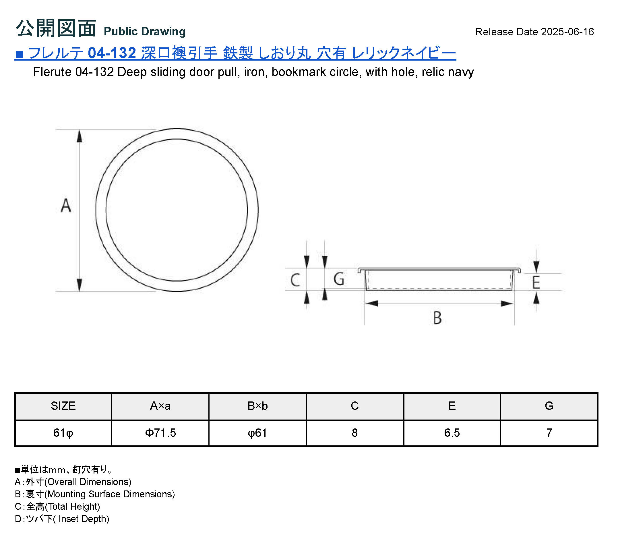 フレルテ 04-132 深口襖引手 鉄製 しおり丸 穴有 レリックネイビー (61φ)