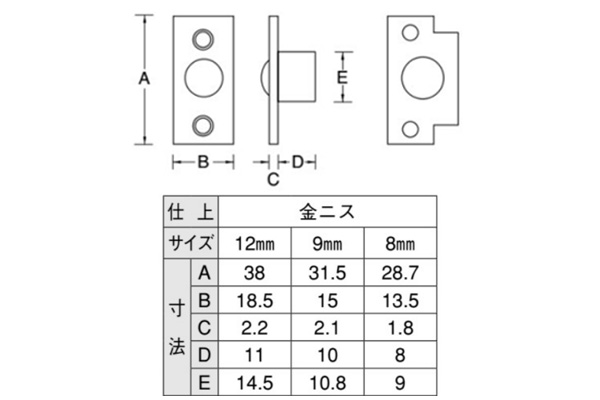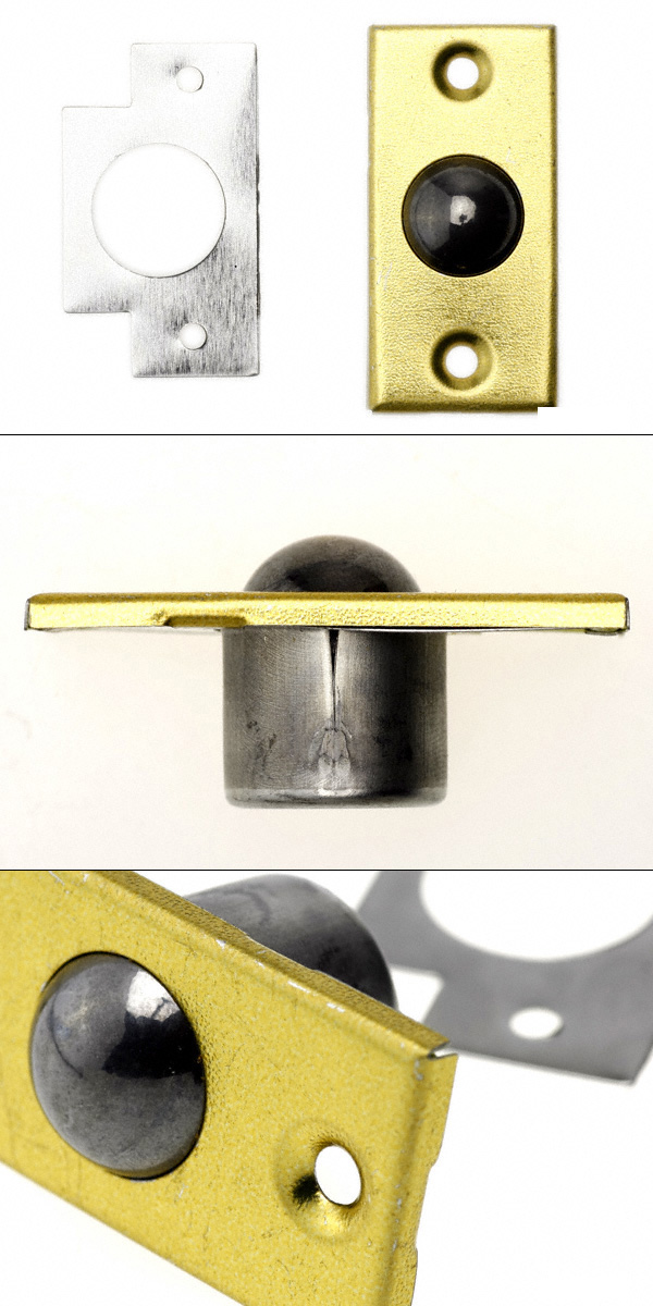 扉側に本体を、柱側に受け座を取り付けます。受け座に玉バネ部が入り込むように柱側に掘り込み加工が必要です。