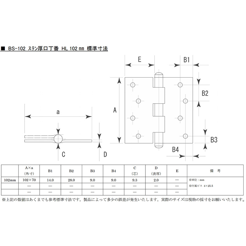 BS-102 ステン厚口丁番 HL (木ネジ付) 102mm(10枚入)