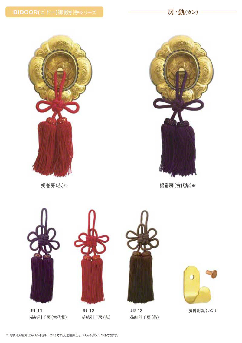 ビドーでは、2024年10月現在、引手房として「JR-11 菊結引手房 芯入 古代紫」を販売しておりますので