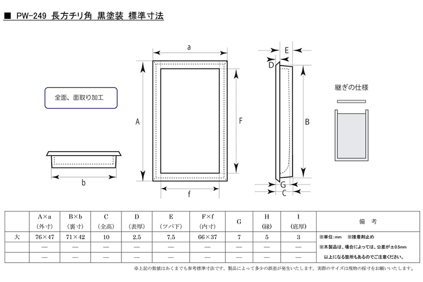 PW-249 長方チリ角 黒塗装 大(71×42)