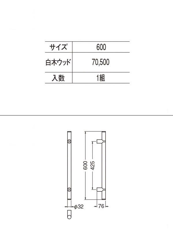 No.194 アルピナ取手 (両面用) 白木ウッド 600mm(ピッチ425)