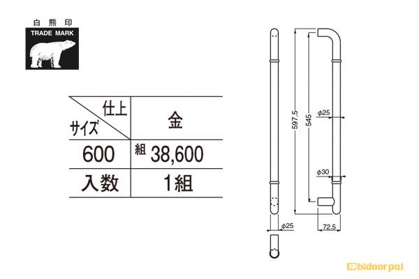 No.255 F形丸棒取手 (両面用) 金 600mm(ピッチ545)